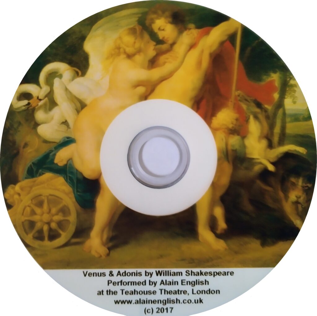 A live performance of the ‘graver labour’ referred to in the introduction verses of Venus and Adonis; This performance incorporates images of classic paintings of the story by Botticelli, Rubens, Veronese, and others to create a dark and brooding atmosphere to accompany this tragic story. You can watch it online here.